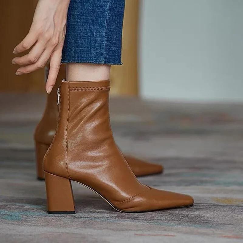 女性用PUレザーアンクルジッパー,厚手のヒールブーツ,スクエアトゥ,ハイヒール,ブラウン,ショート,ヴィンテージ,秋,2023_61